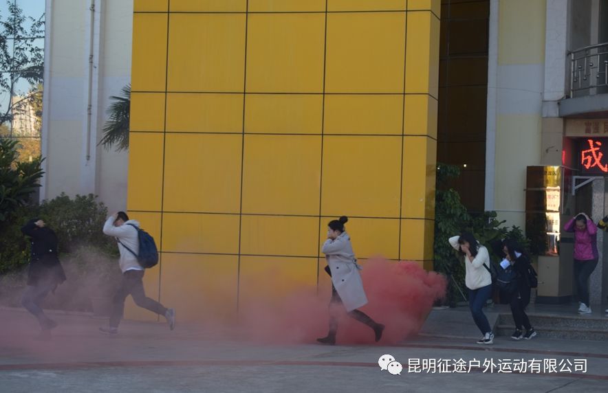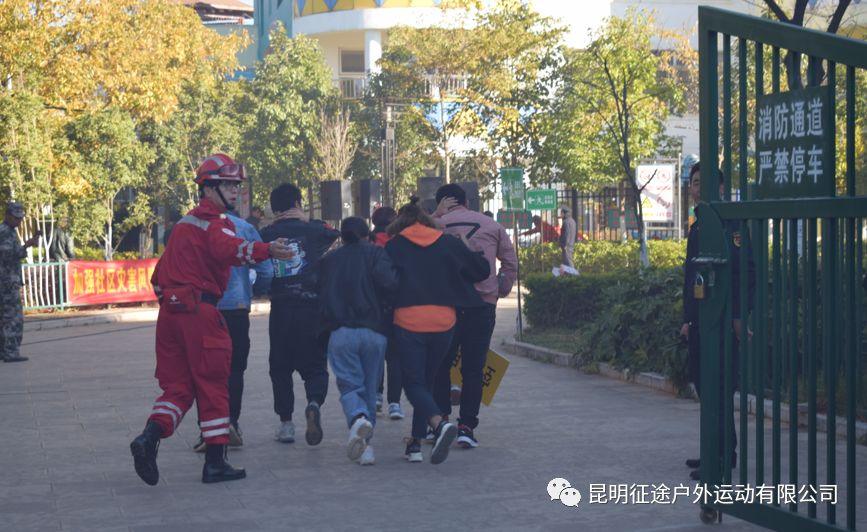 救災演練正式開始,模擬地震災害發(fā)生場景,昆明征途的教練們指導受“災群眾”在第一時間逃