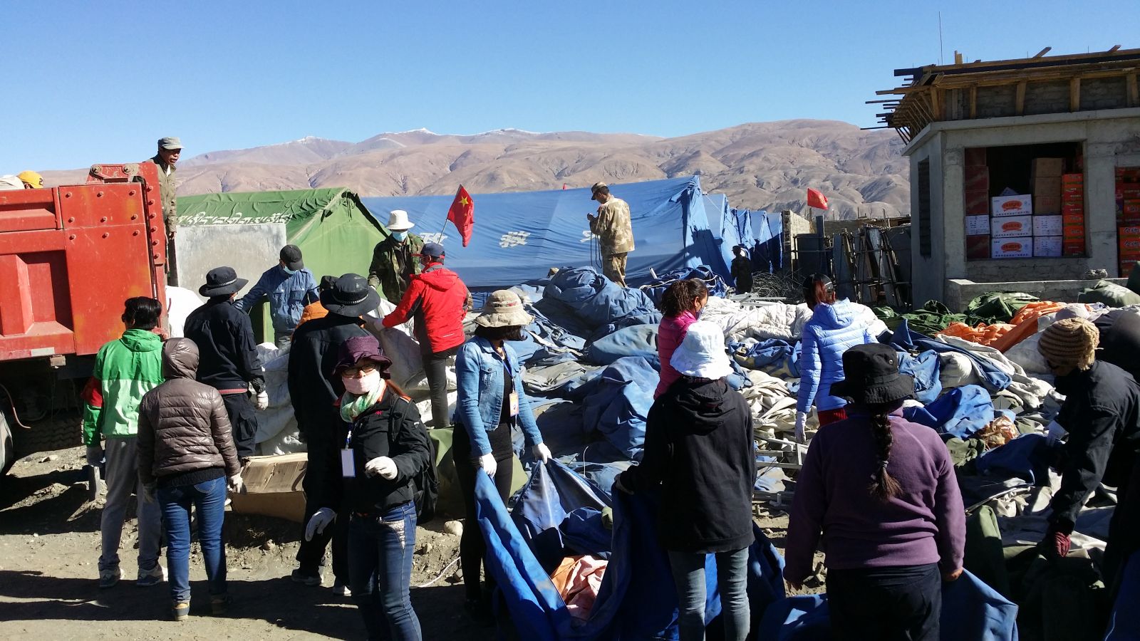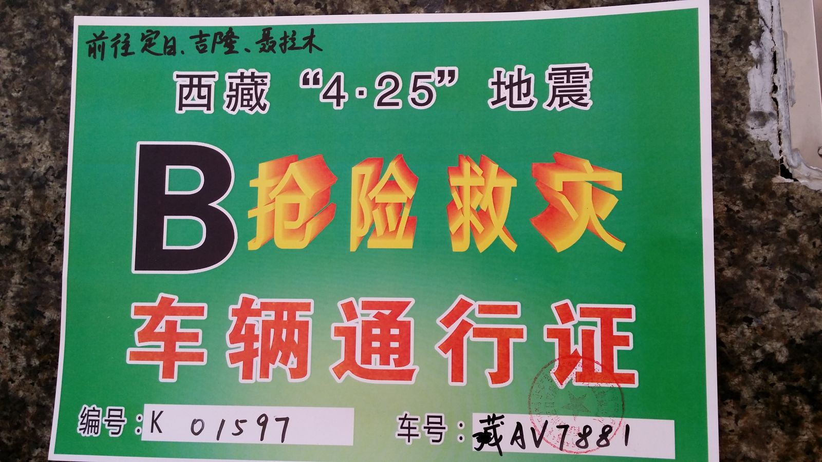 5月2日,救援隊在拉薩獲得援助在災區(qū)的越野車,購買了部分自用物資。隨后第一時間奔赴日喀則市,并在與當?shù)卣蛻本葹闹笓]中心工作人員協(xié)調(diào)后,獲得國家合法進入災區(qū)搶險救災的通行證與身份認可證。辦完相關(guān)手續(xù)之后救援隊進入核心災區(qū)定日縣,途中遇到許多軍用車和救災車輛,政府第一批救災物資已經(jīng)基本到位,災民也基本得到妥善的安排。5月2日晚救援隊趕往拉孜縣,縣區(qū)情況良好,災民生活也得到妥善安排。隨后救援隊趕往海拔接近5000米的重災區(qū),大部分獅友也已經(jīng)客服了高原反應。