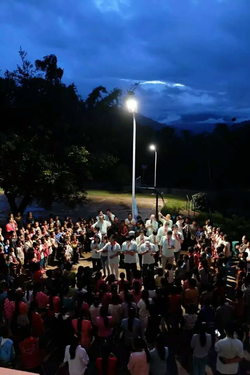 8點(diǎn)半,西盟的天色剛轉(zhuǎn)暗不久,6盞太陽能路燈同時(shí)亮起,在大小朋友們的歡呼聲中,操場和宿舍前的道路從此告別了黑暗。圍坐在心形排布的蠟燭邊,志愿者們互相交流心得,更堅(jiān)定了繼續(xù)做出奉獻(xiàn)的決心。